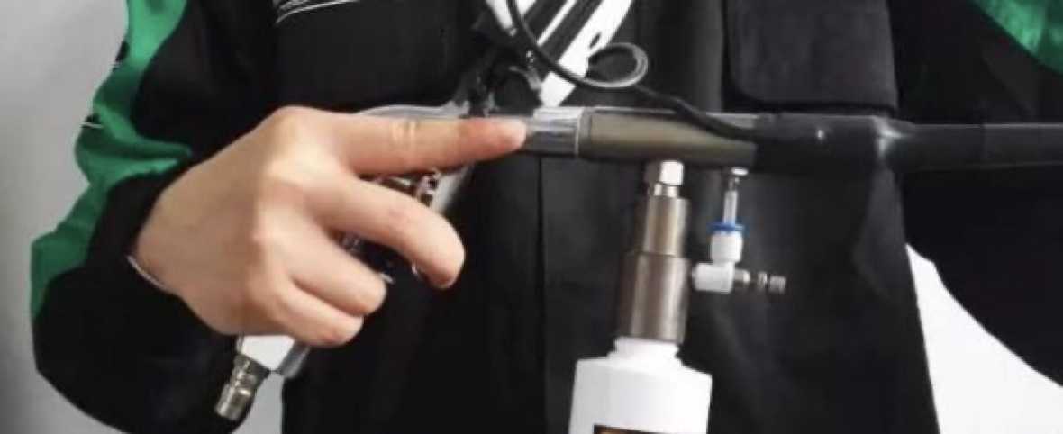 5、把祛油污剂装在清洗枪上,喷枪接通打气泵,手持喷枪,把喷枪头靠近蒸发箱上部位置,向蒸发箱均匀喷洒祛污剂,等待1分钟左右,污渍发泡、软化、松驰;