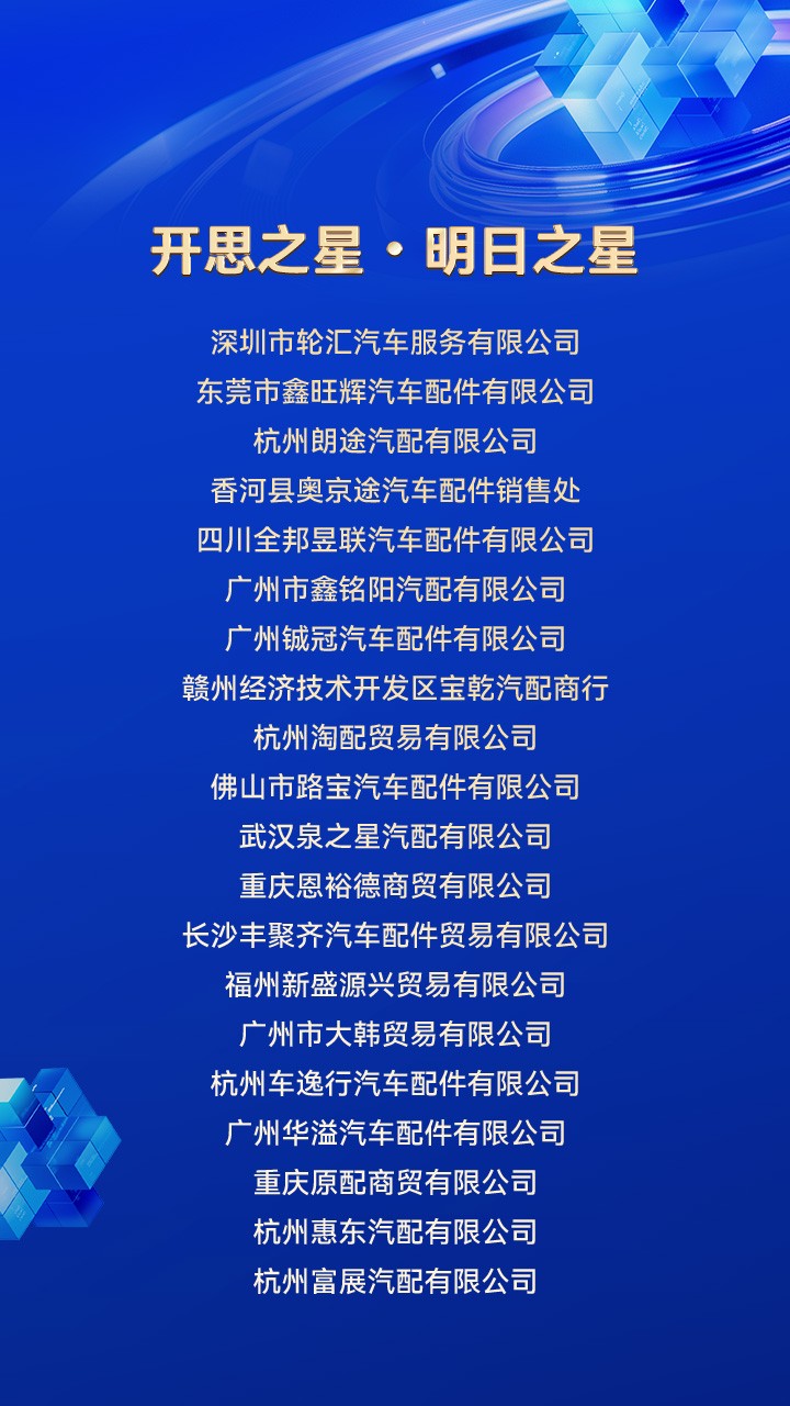 入选「开思之星」榜单的获奖企业,不乏区域甚至全国性的龙头汽配企业,他们是中国汽车后市场不可忽视的明星公司,更是积极向上的探索者和改变行业的中坚力量。我们希望这些获奖企业能再接再厉,再创佳绩,和开思一起推动汽车后市场数字化转型。